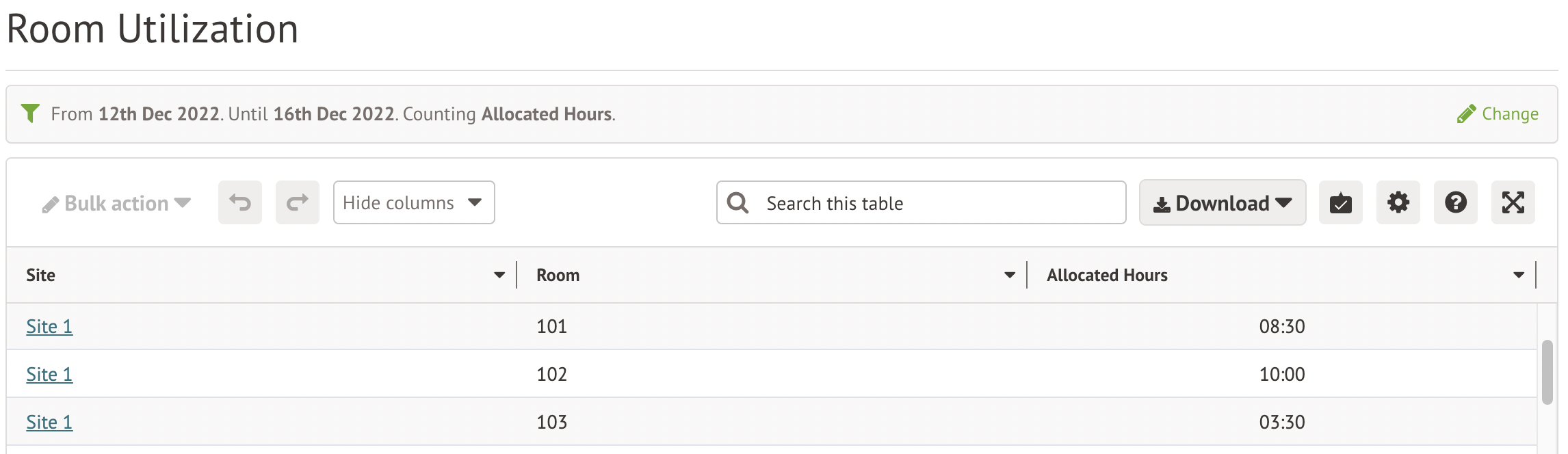 Go to School > Timetable > Sites & rooms > Room Utilization to see the number of periods the room is in use for between the specified dates. Use the filters at the top of the page to select the relevant date and times. Click the room to access the school calendar.