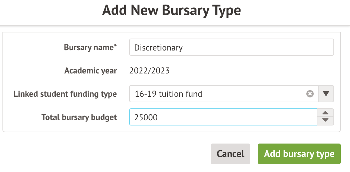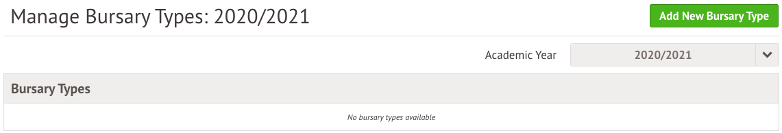 On the bursary dashboard, click the Add New Bursary Type button. Make sure you're adding the bursary to the right academic year.