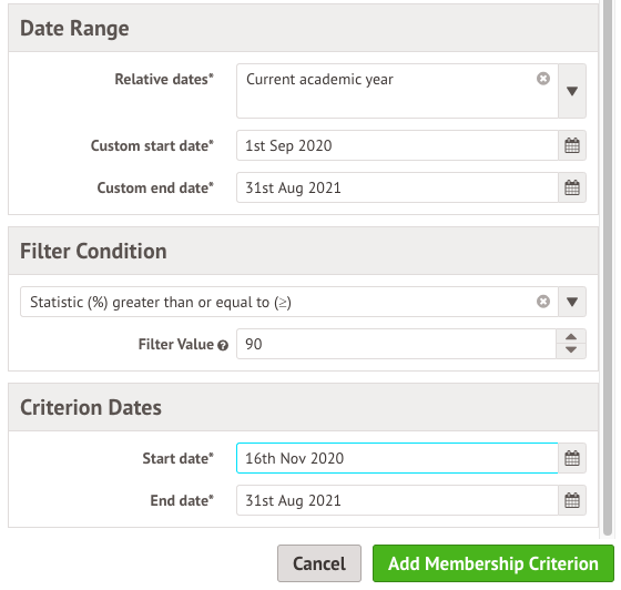In the slide over, select the date range to look at (for example if looking at attendance, the percentage considered will look at attendance between these dates).