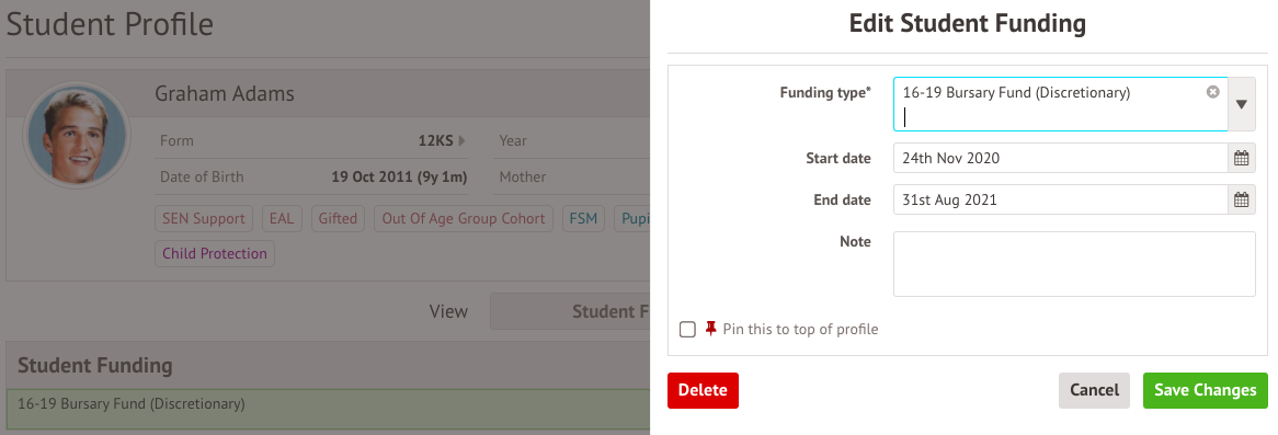 You can view the student funding record from the Student Funding section on the student's profile.