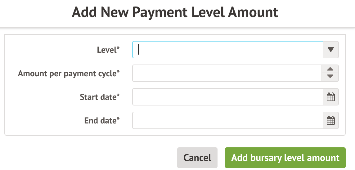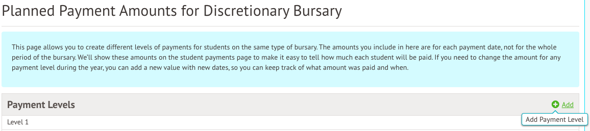 Once you have set up your different levels, you'll need to assign a payment amount to each one. You can add more than one payment amount to a level if the payment amount will change mid-way through the year.