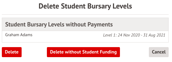 If you select to delete, you have the option to delete the bursary level and the linked funding record (select Delete), or just delete the bursary record (select Delete without Student Funding).