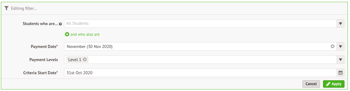 - The criteria start date (this will default to the date of the last payment)