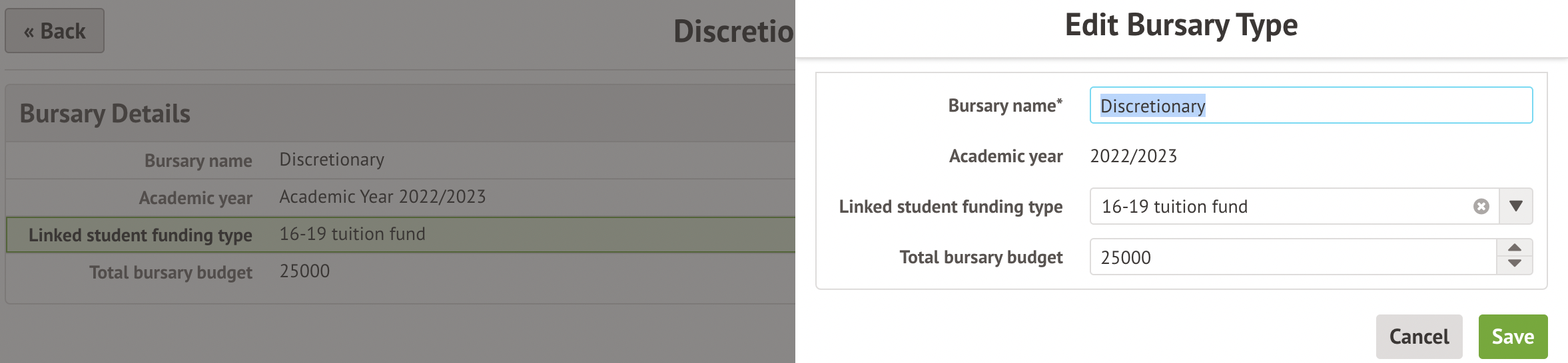To edit any of these fields, return to the Student > Bursaries page and select the bursary. Click any of the fields to edit.