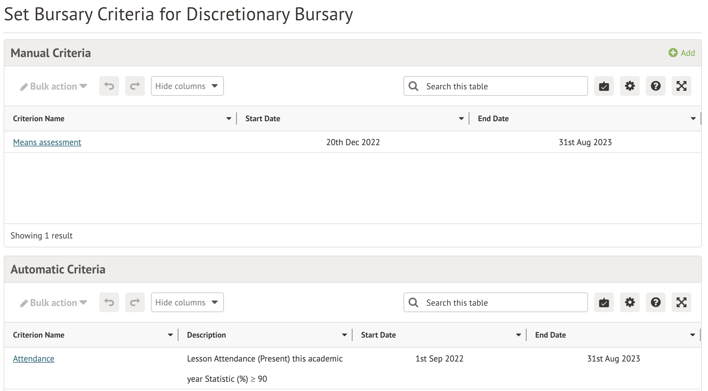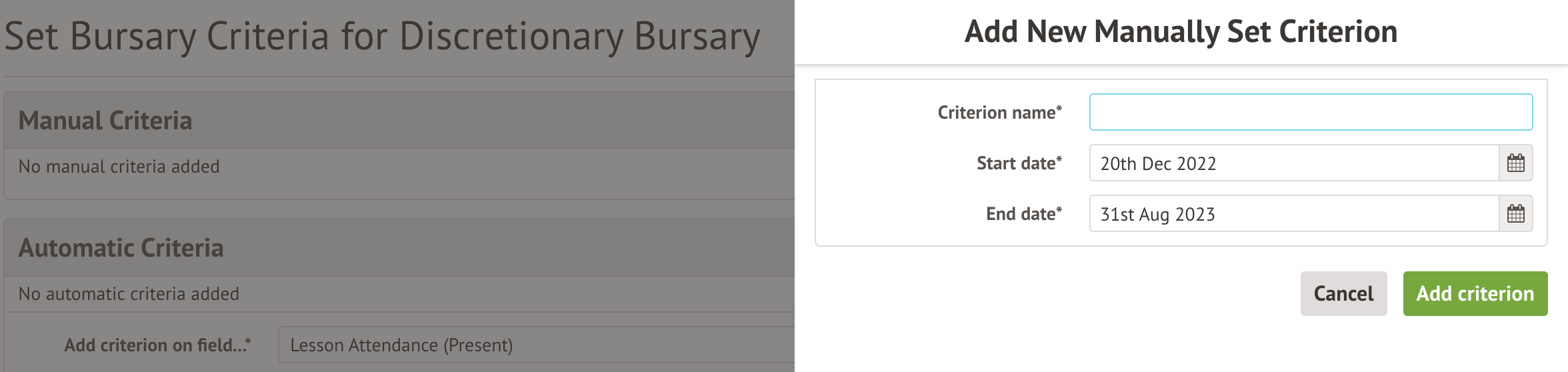 The criterion dates determine when the criteria will show on the Planned Student Payments page to help you determine whether the bursary should be awarded.