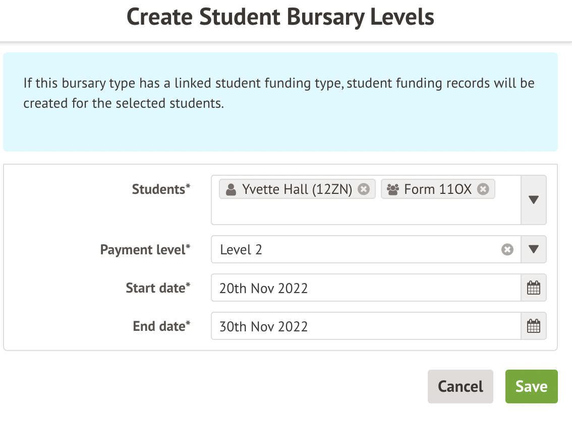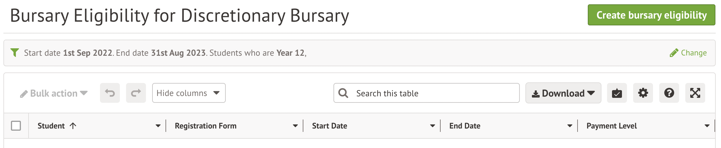 - Change the start or end dates of the eligibility - this will also change the date of any linked student funding record. Please note that you cannot backdate the start date. If bursary eligibility records already have bursary payments associated to them, the end date must not be before the payment date.