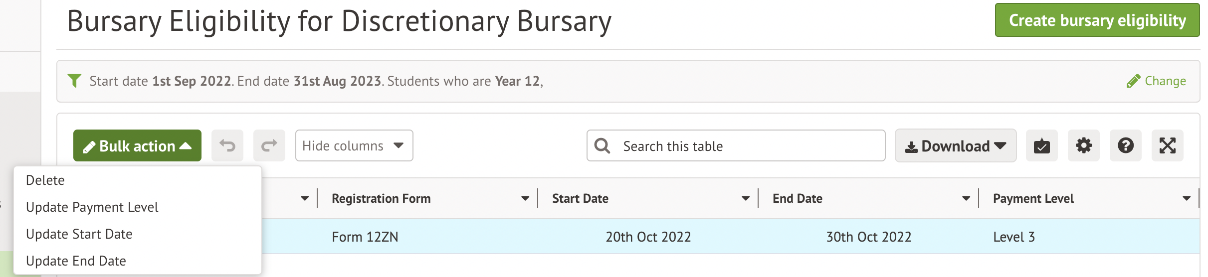 To add students, click the Create bursary eligibility button. This will also create a student funding record on their student profile.