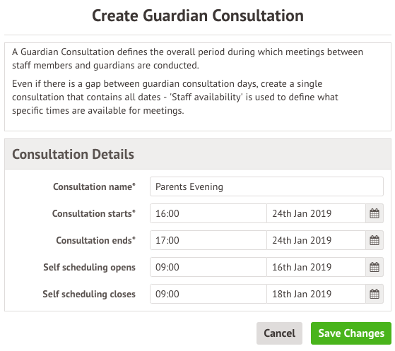 To allow guardians to book a slot through the Parent Portal or Parent App, you will need to set a self-scheduling period for guardian consultation. Your self-scheduling period is the dates and times between which you allow parents and guardians to sign up for a meeting via the Parent Portal or App Guardians will not be able to book a slot until the self-scheduling period is open.