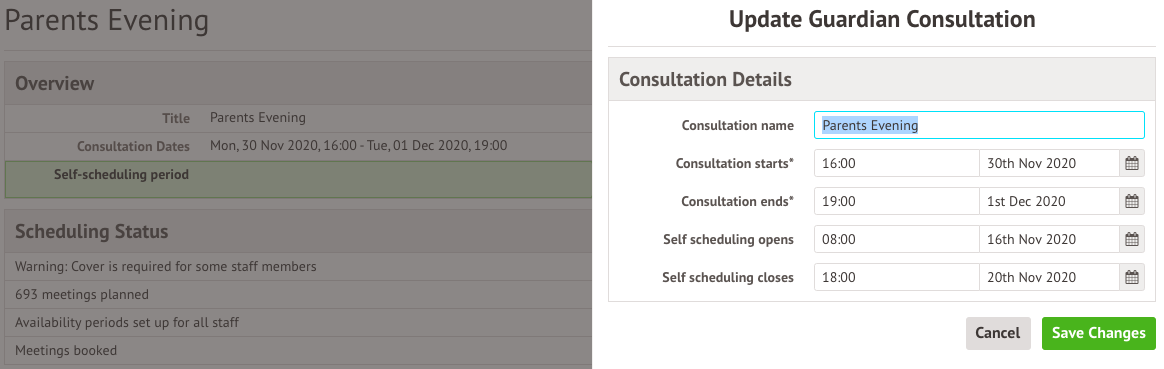 Outside of the self-scheduling period, school admins will still be able to book and amend meetings via Students > Parents & Guardians > Guardian Consultations > All Guardian Consultations.