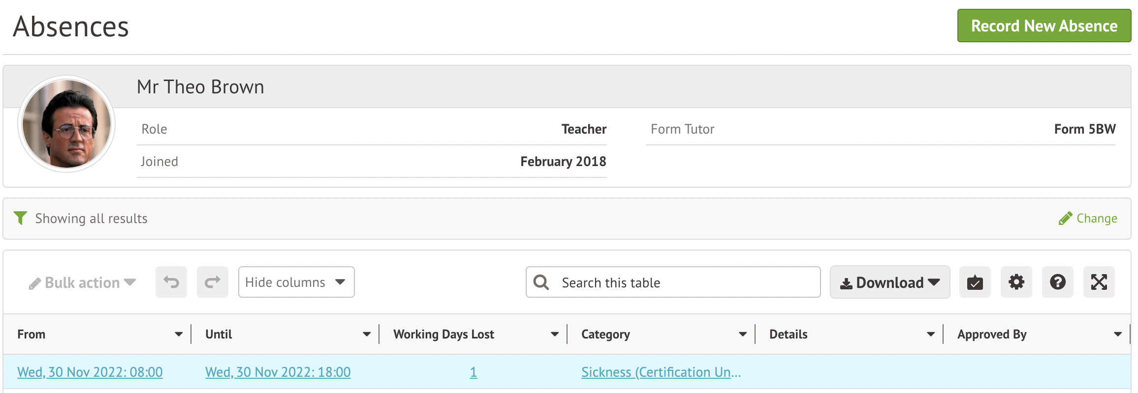 To check for absences, navigate to the staff member's profile page and click on Absences on the left side. Click into the absence to amend the date range so it doesn't overlap with your Guardian Consultation.