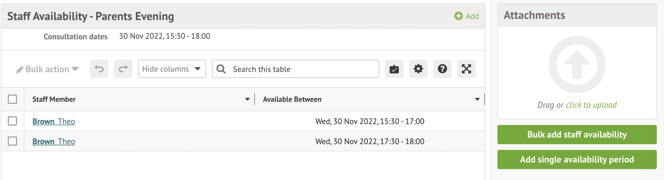 You'll need to add the availability of staff to attend guardian consultation meetings, enabling parents to book a slot through the Parent Portal or Parent App. Add this from the Staff Availability section.