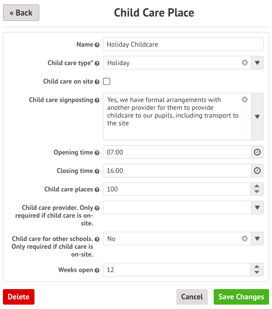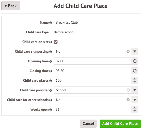 In the Spring Census, your school is required to provide information on the childcare places your school provides. You must input this information into your site, even if you don't offer this type of childcare.