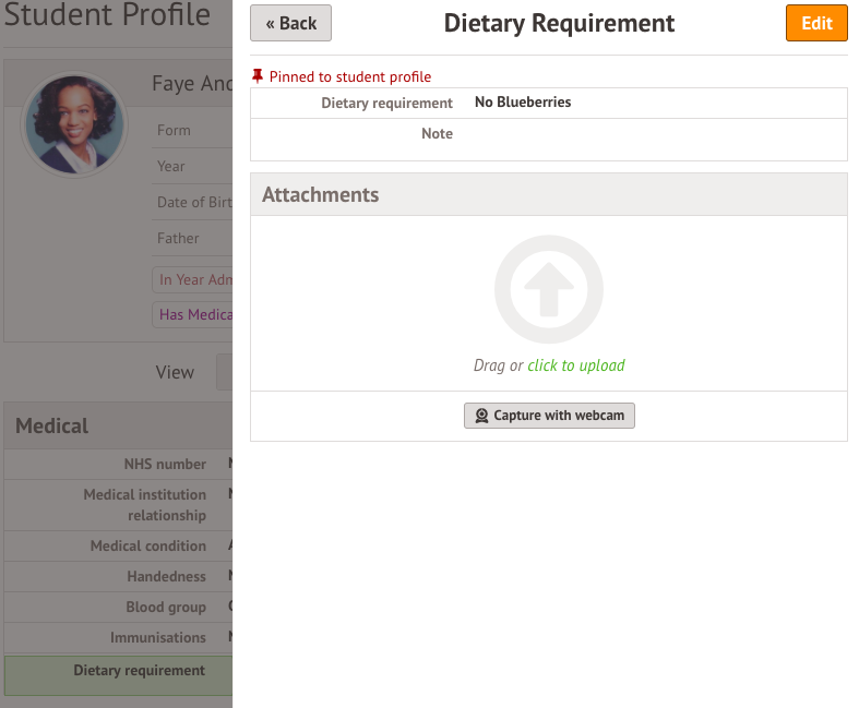 Dietary requirements can help your catering and staffing teams understand what to serve your students. They are also listed in the Meal Register, so your teachers can ensure they don't assign a meal that the student cannot eat.