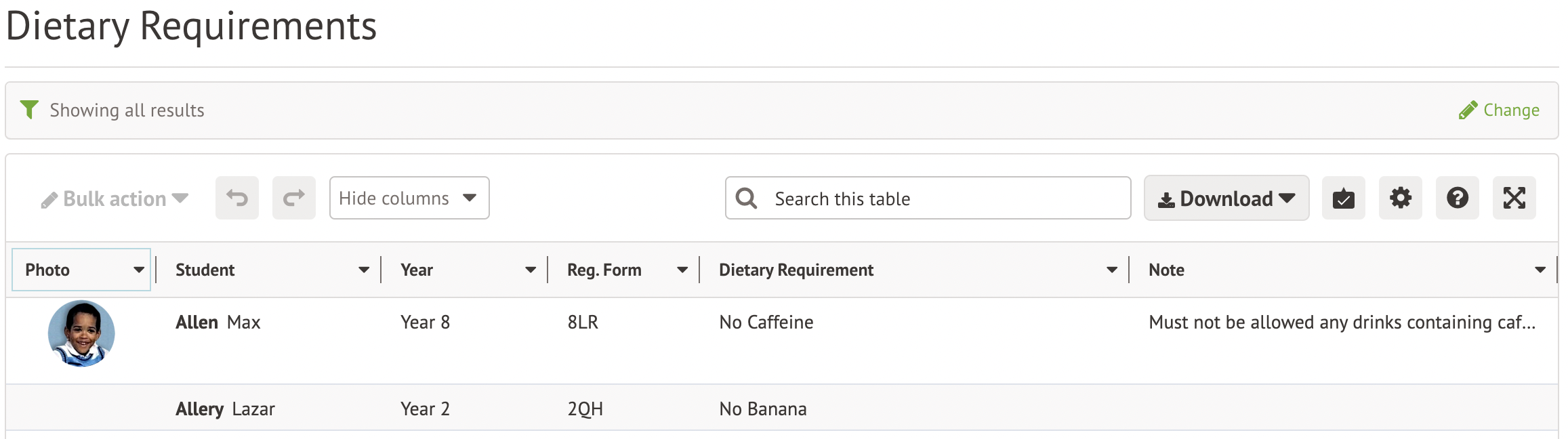 Go to School > Meals > Dietary Requirements to view a table of all students in the school with dietary requirements.