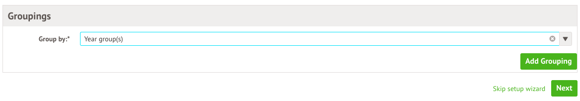 In the Groupings section, add your student group grouping, for example, year group, and click Add Grouping.