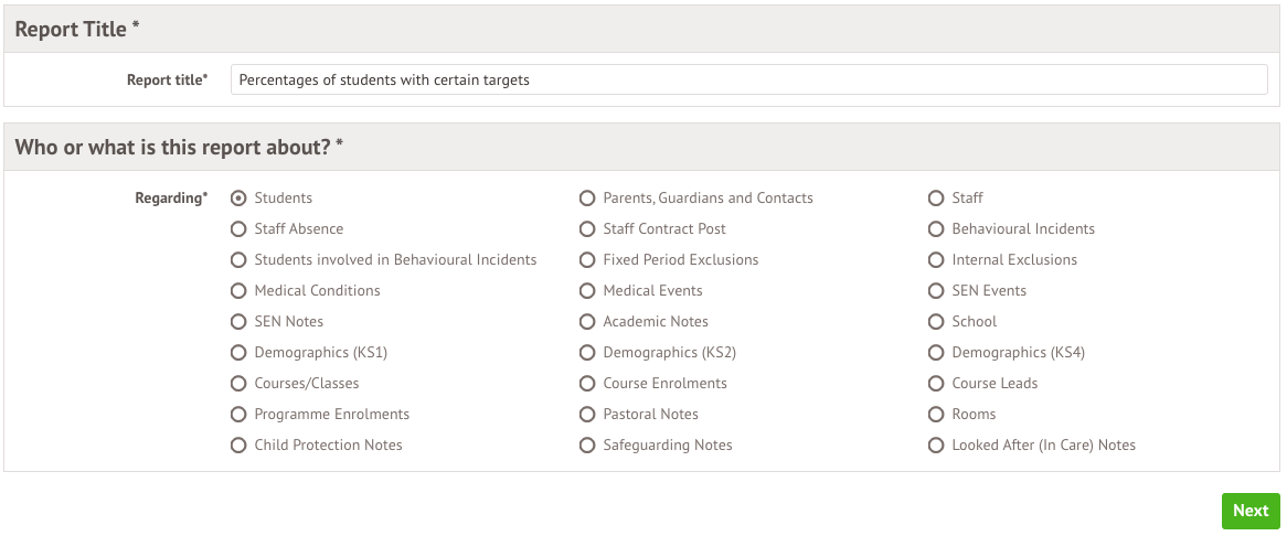 Click to create a new blank report. Add a title, and select that your report is about Students.