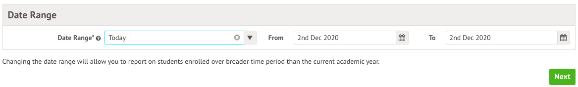 Next, choose the date range of your report. This will determine which students will be pulled into your report.