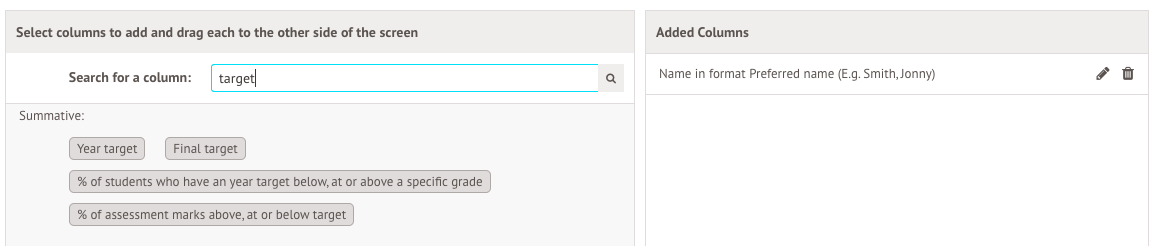 Next, search for the target column you'll need, and click and drag it over to your list of columns. You can use year target or final target, but not period targets.