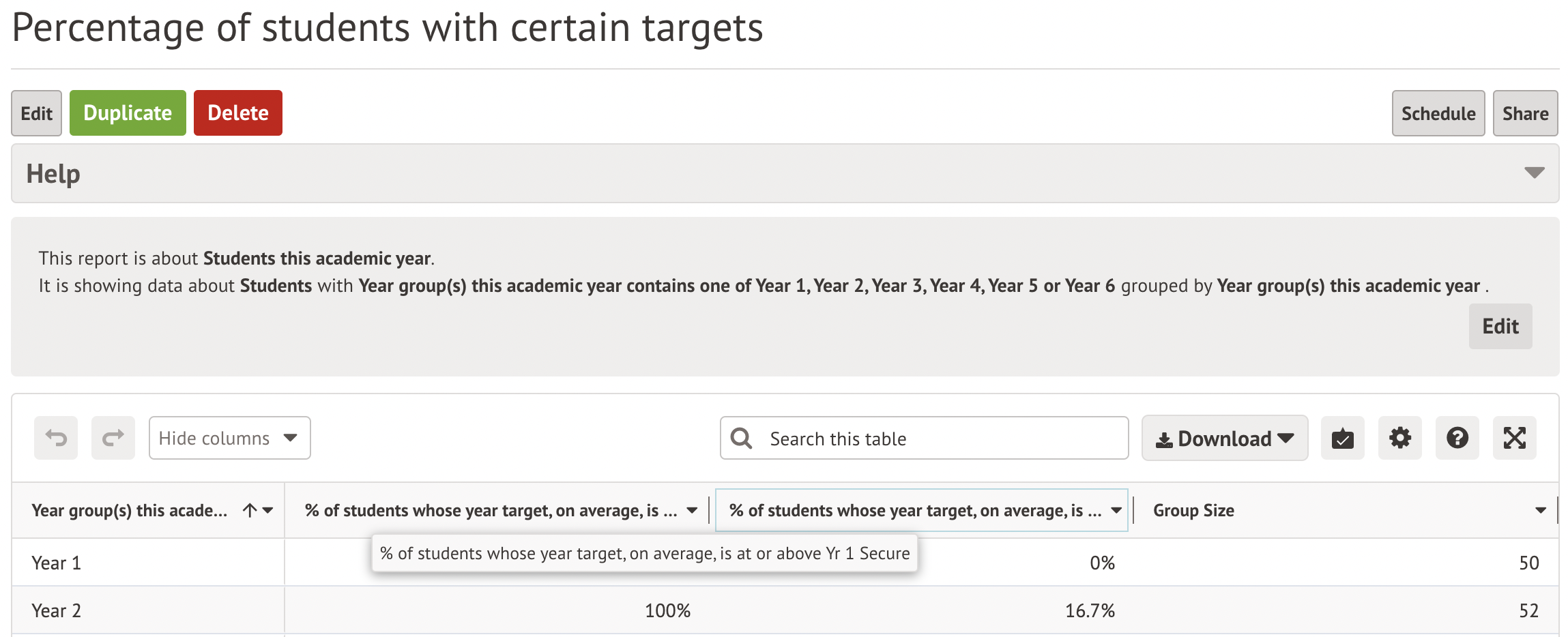 Click to save and view your report. You can then see the percentage of students who have been given each target. You can then share it with other staff or download it to excel, PDF or live feed.