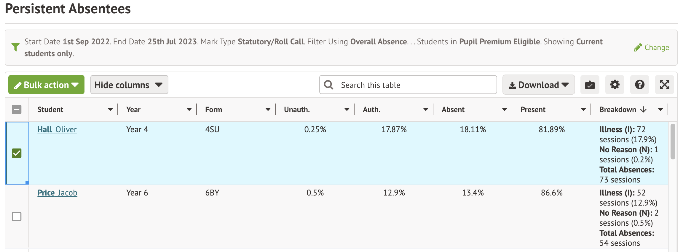 For example, you can just jump straight to the Students > Attendance > Absentees reporting pages for out-of-the-box pre-built tables, that you can filter using built-in demographic groupings like Pupil Premium vs Not.