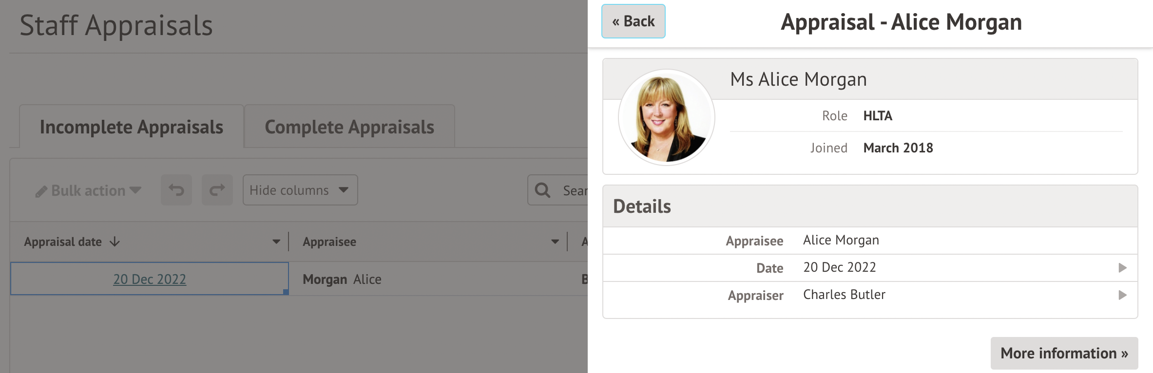 Select the appraisal and click More Information in the slide over.