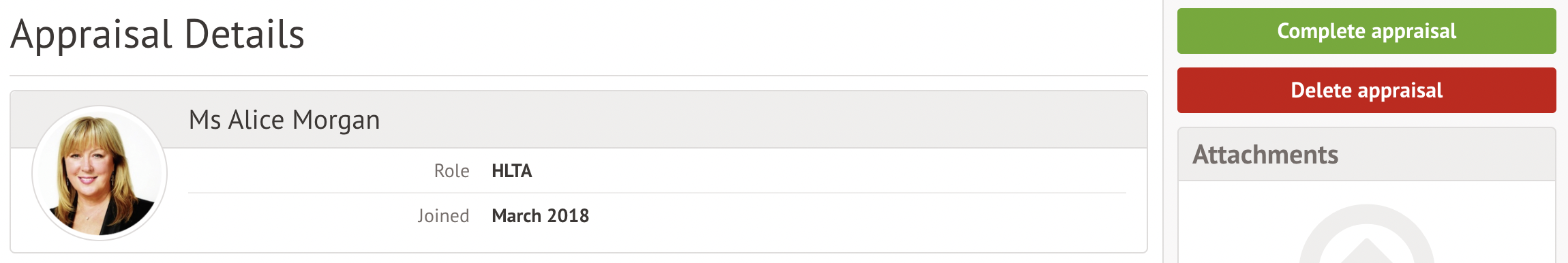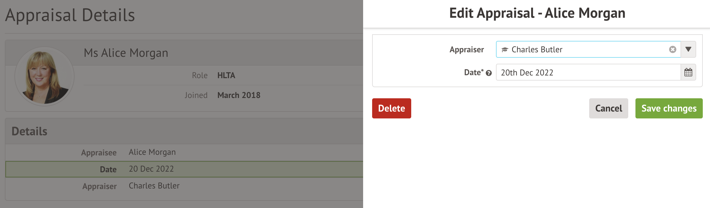 You can also delete Appraisals for an individual staff member. Navigate to a staff profile, and click Professional Development from the left-hand menu. Click the appraisal to access the Appraisal details page as shown in the section above.