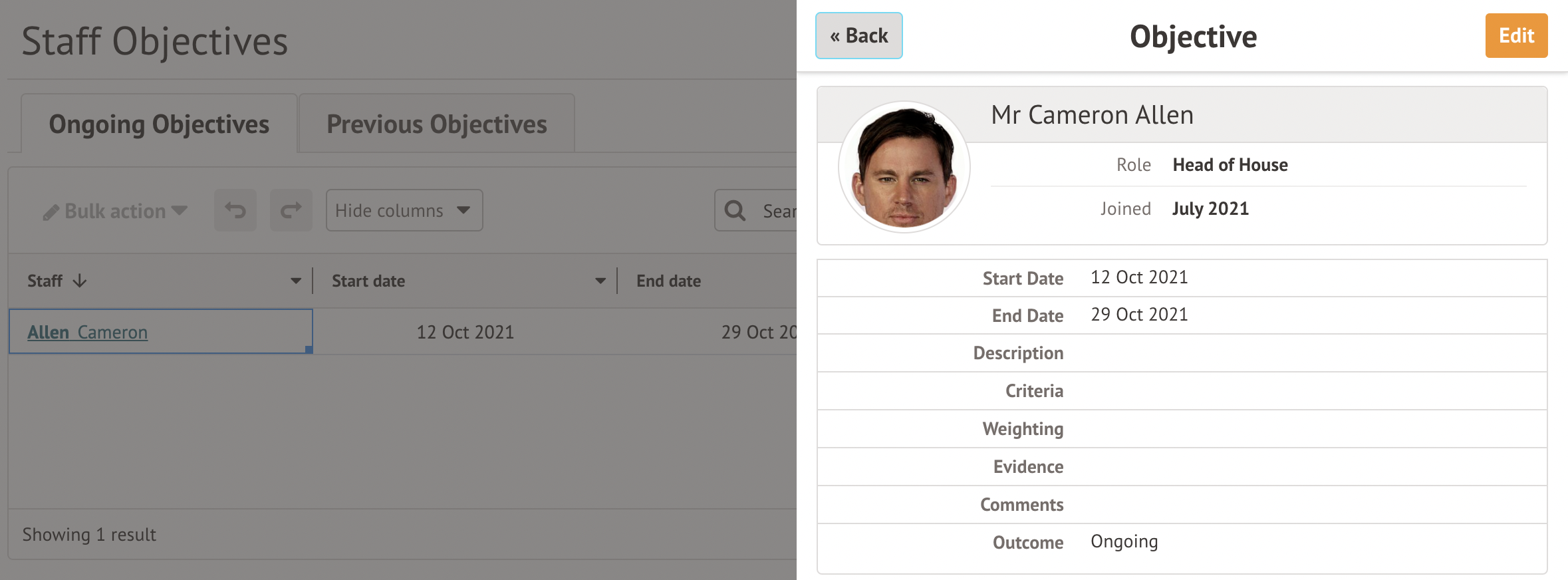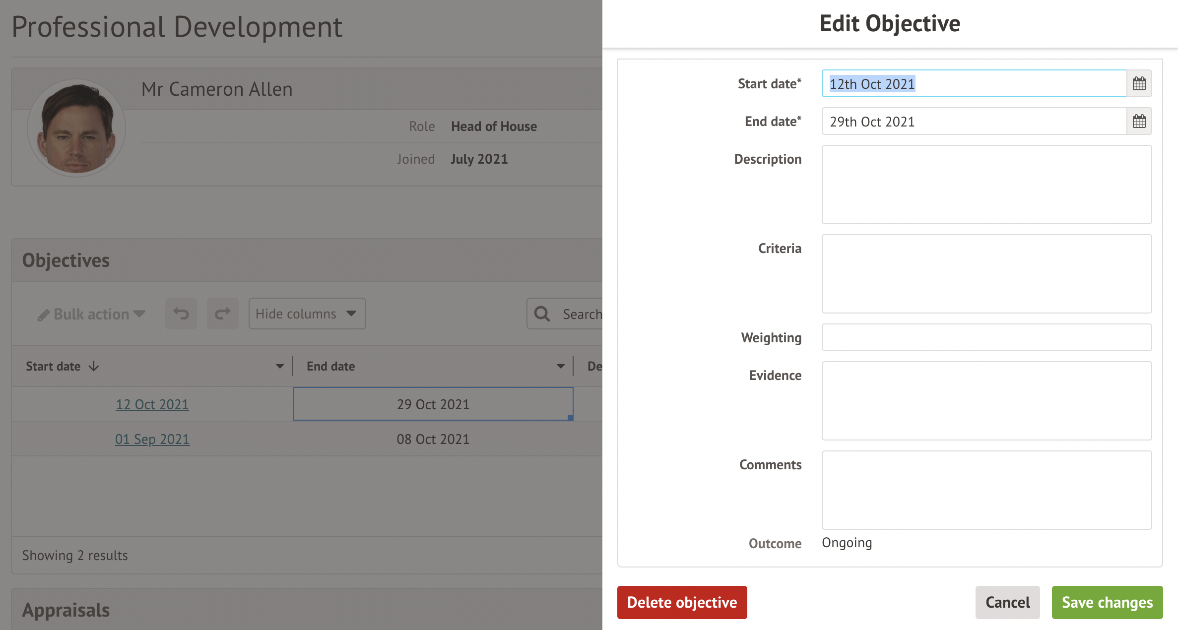 Go to School > All Staff > Staff development > Objectives. Select the Objective to edit or delete from this table.
