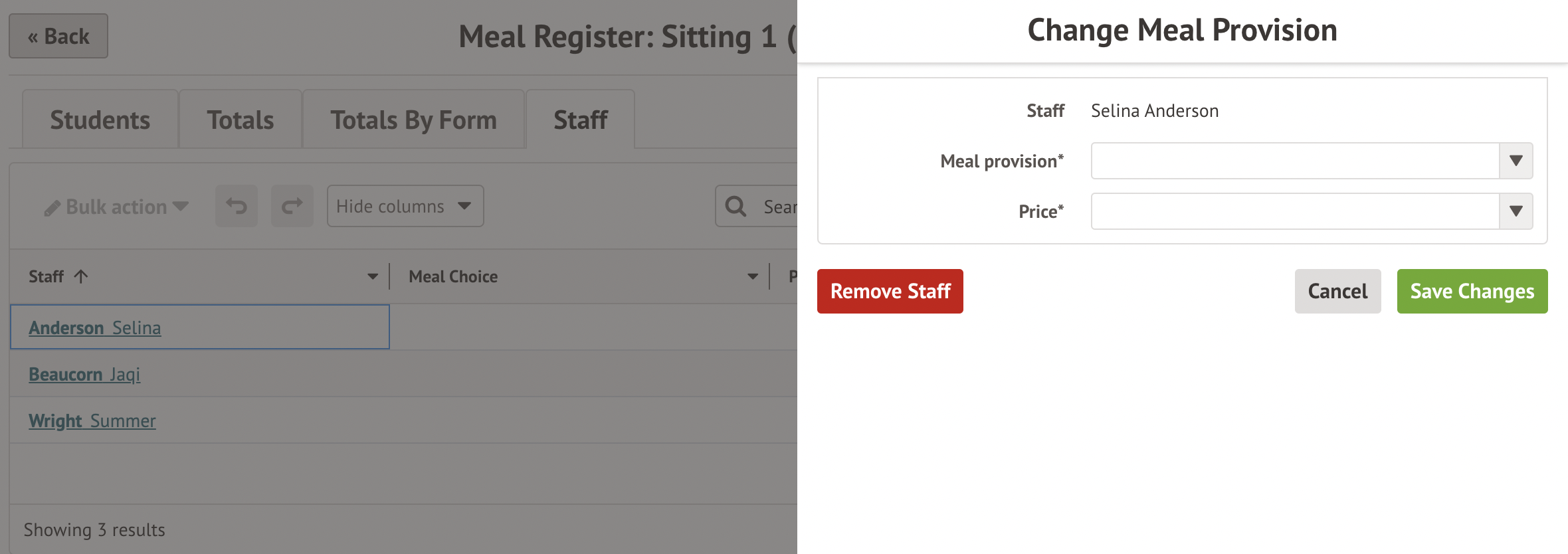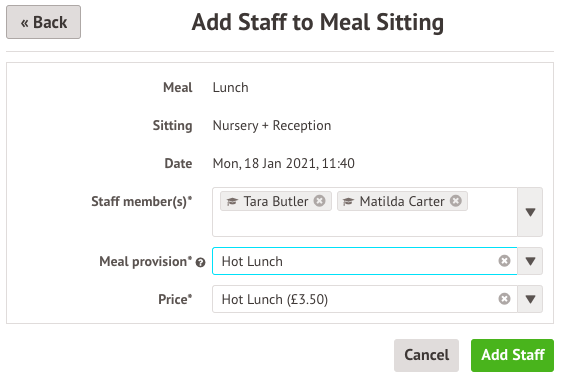 Once you've set up staff meals, staff will be automatically given a meal (if you've given them a regular meal choice) or you can add staff to a meal manually each day. Teachers cannot select their meal choice from the Meal Register when selecting meal choices for their students.