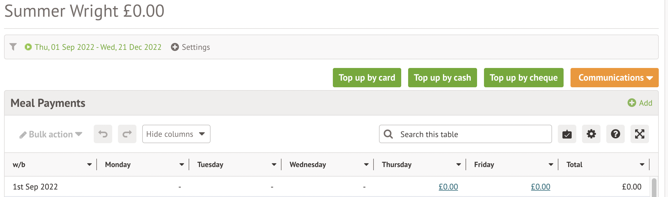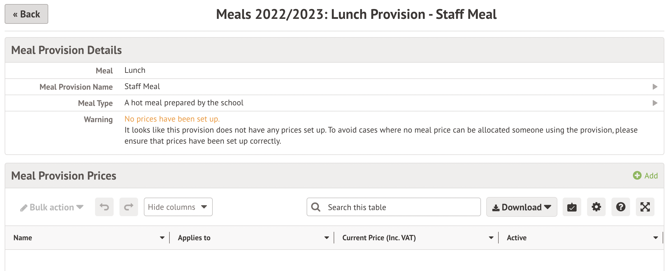 First, check you have card payments enabled on your site. To be able to set prices for staff, make sure you have set up a Meal on your site from School > Meals > Setup. You can see how to complete these steps here: Setting up meals.