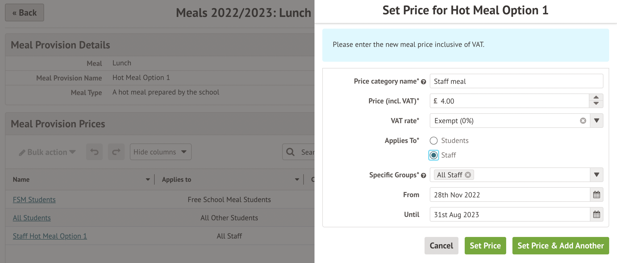 Add a staff price to an existing meal provision