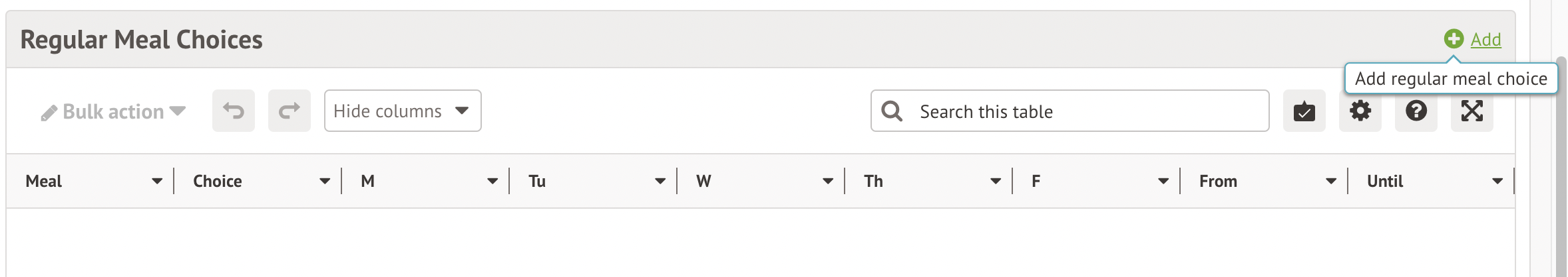 You can then see a new section for Regular Meal Choices - this will mean you don't have to add in which meal they are having every day. Click +Add.