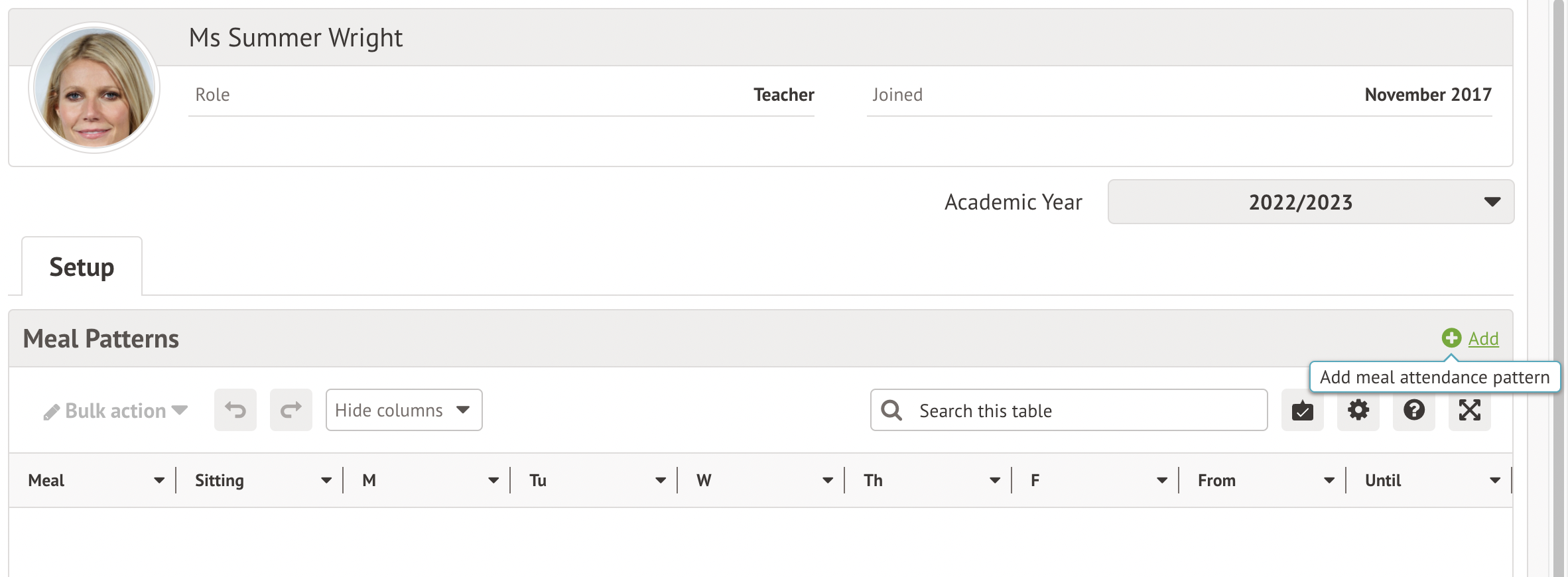 Unlike with students, there isn't an area where you can add staff meal patterns in bulk. Instead, you'll need to add them from the Meals section of their staff profile.