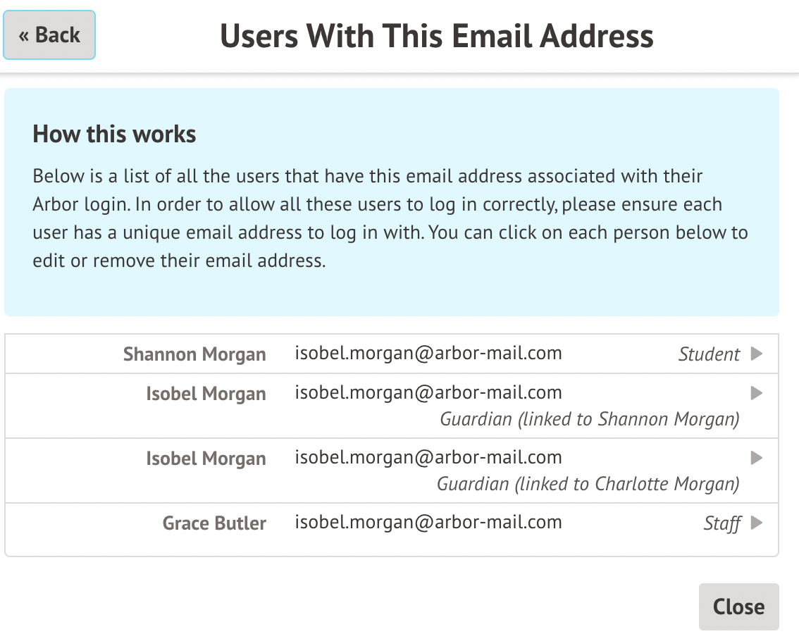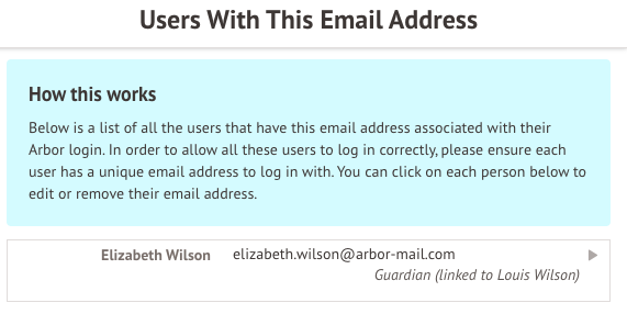 If you've recently rolled out Arbor, the Parent Portal or Student Portal, you may have people logged into the wrong account, such as guardians being logged into a student account, or staff being logged into the Parent Portal. This often happens due to two or more profiles sharing an email address; resolving such duplicates helps prevent and resolve sign-in issues.