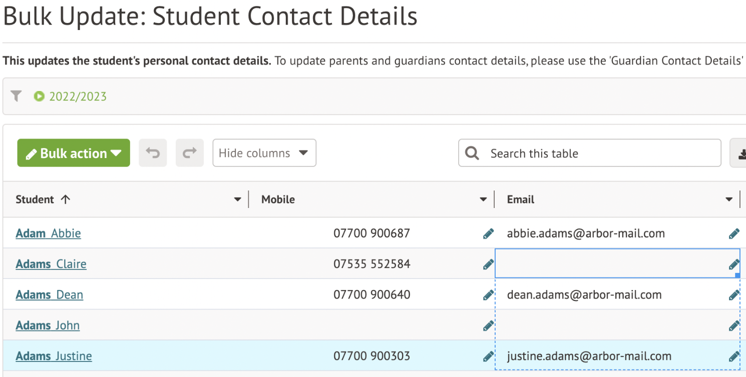 However, some pages allow you to delete email addresses in bulk, such as if you do not use the Student Portal, and don't want to store email addresses for students. In this case, you can go to Students > All Students > Bulk Update > Student Contact Details.