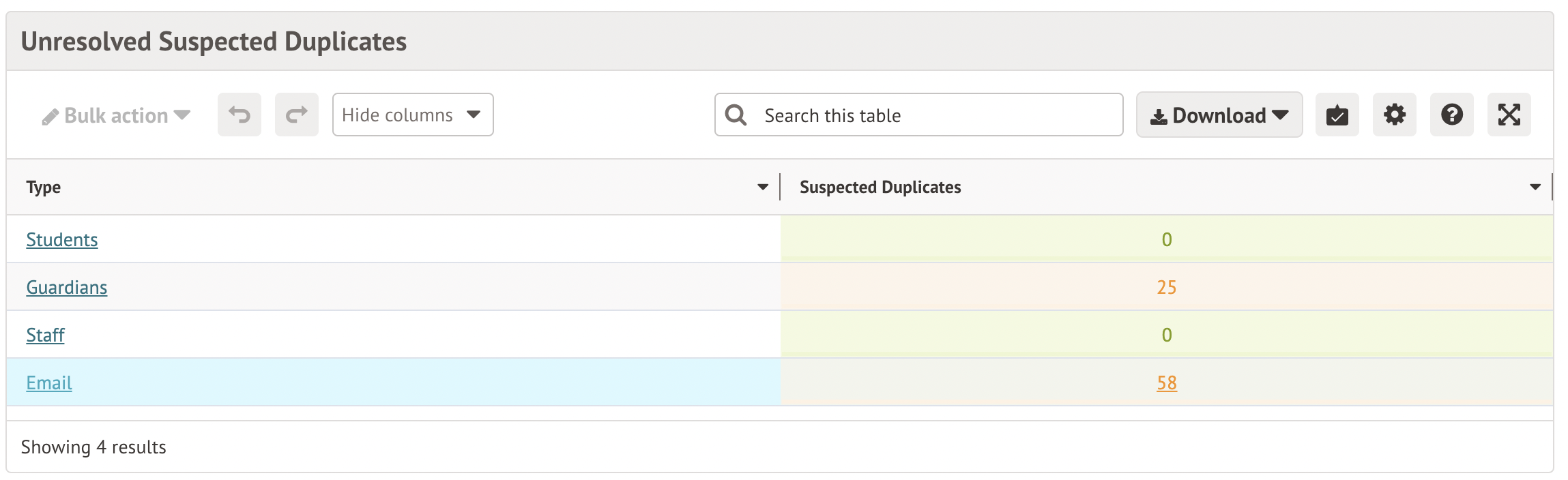 To start fixing duplicates, go to School > Data > Data Quality Dashboard > Suspected Duplicates > Emails.