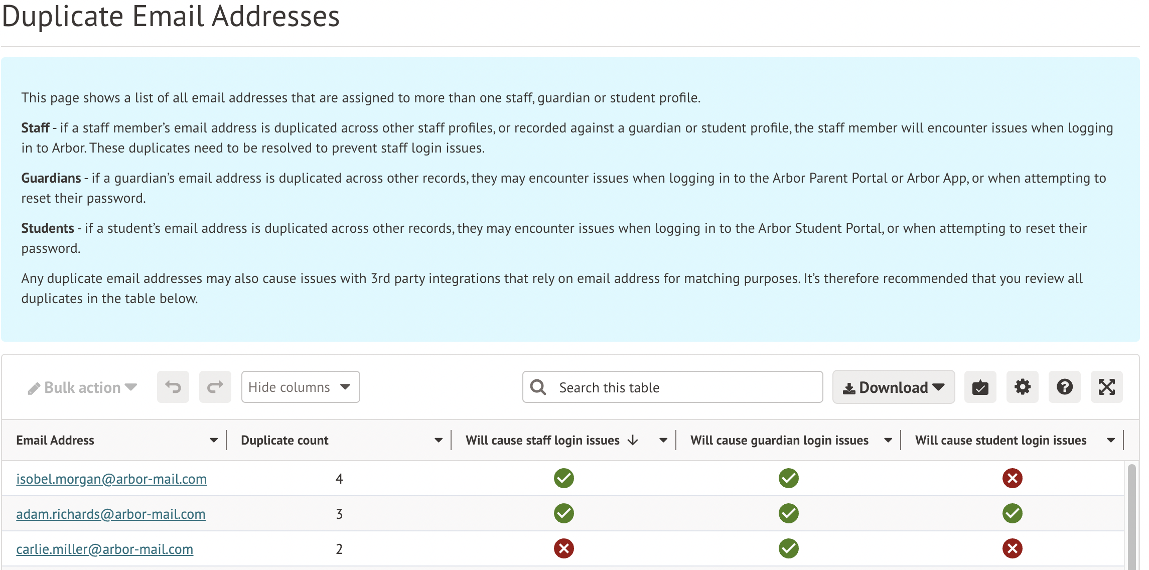 This page lists email addresses that are present on more than one profile and will cause login issues for staff, parents or guardians. We recommend resolving the ones with a tick in the Staff column first.