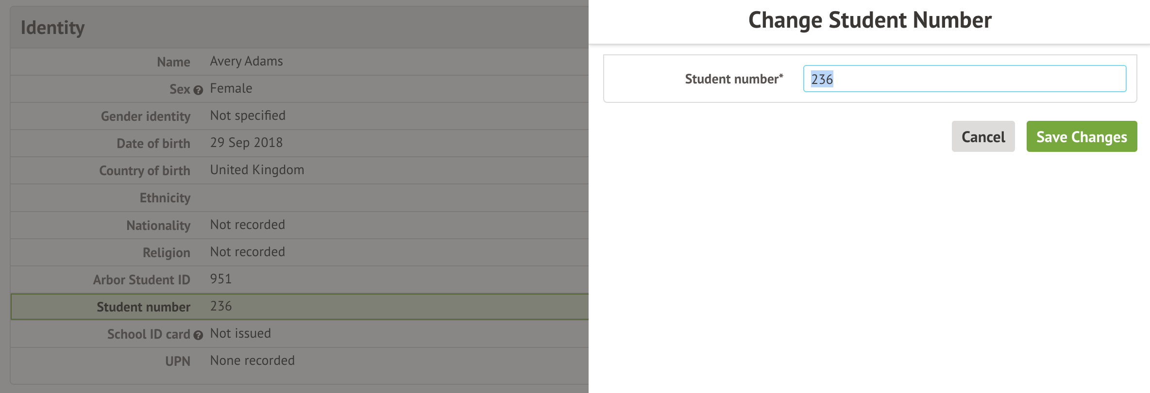 You can see and edit a student's Student Number in the Identity section of their student profile.