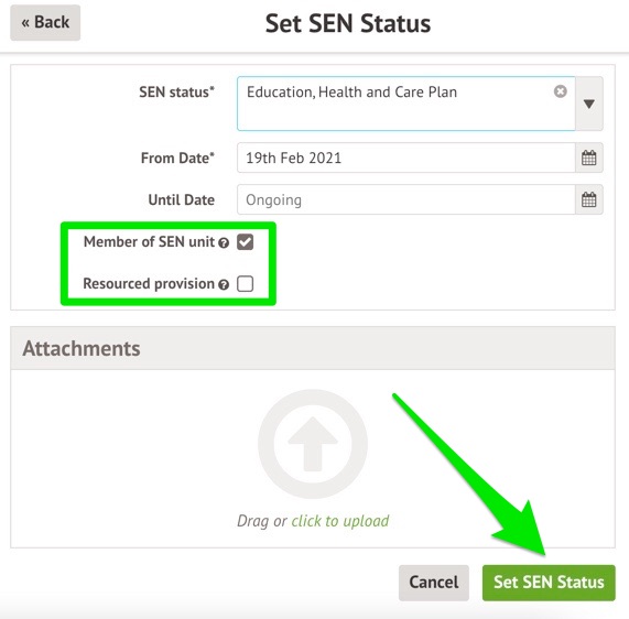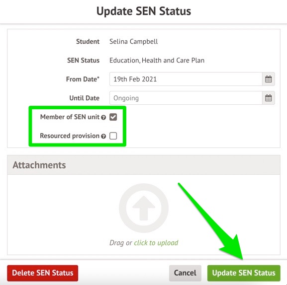 Tick the Member of SEN Unit box or the Resourced Provision box, depending on which applies for this student.