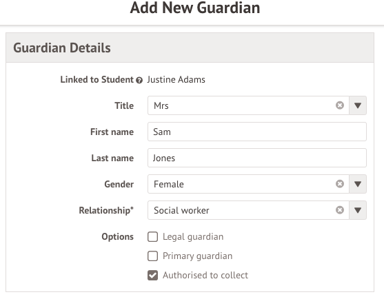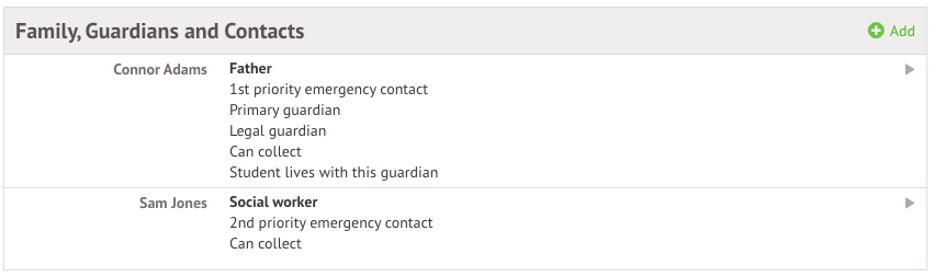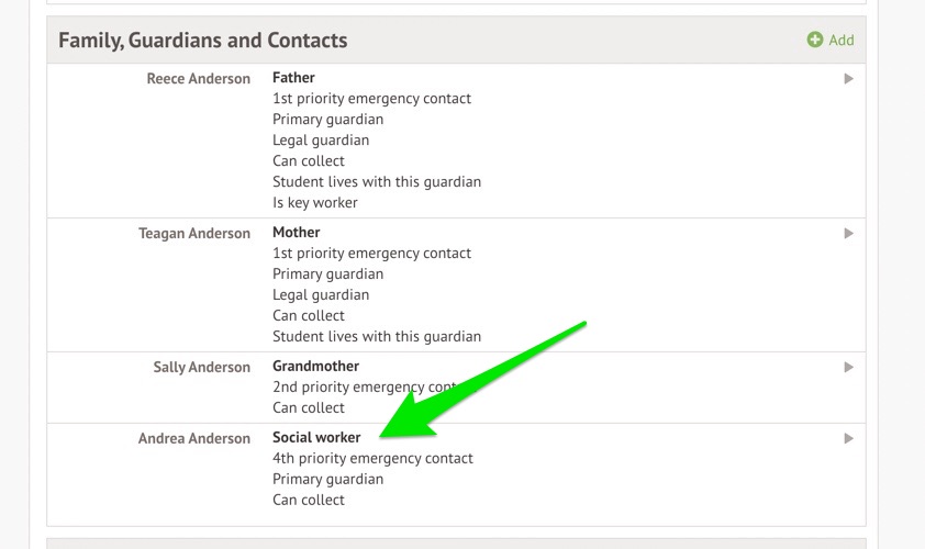 Social Workers, Early Help workers and other people who are not family members but need to be linked to the student, should be added from the student profile. You'll need to add them in the same way you add guardians, in the Family, Guardians and Contacts section.