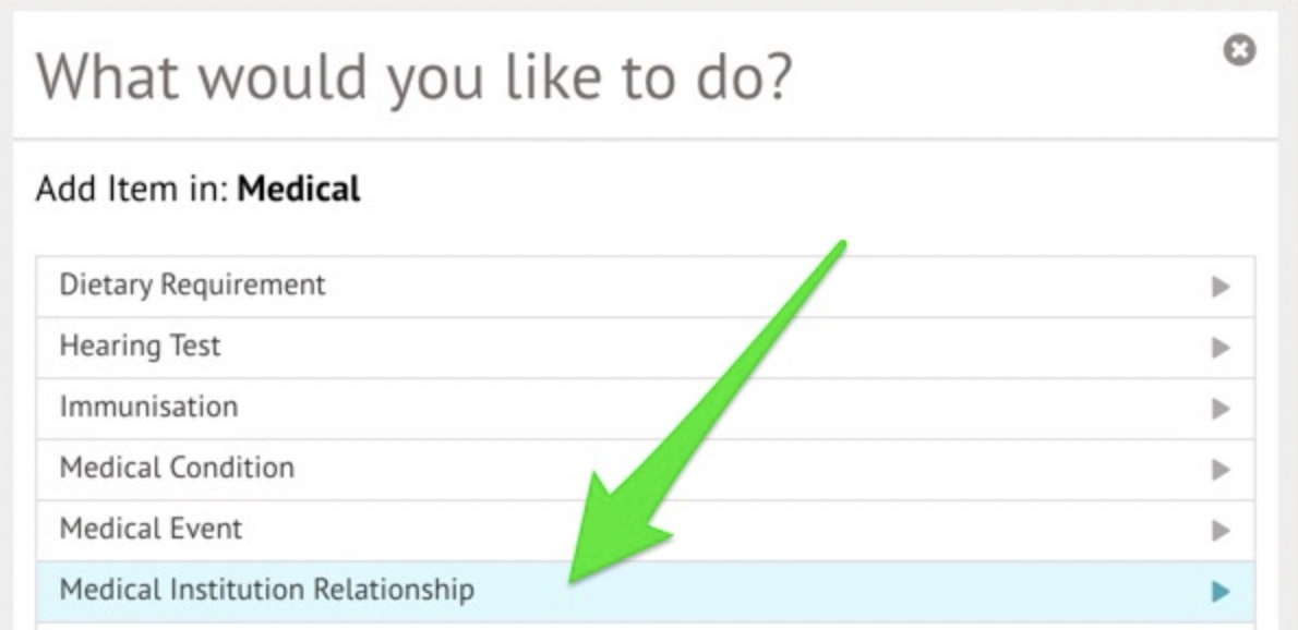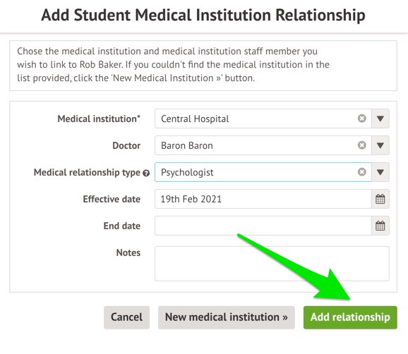 If you can't select the right institution, follow this article to add a new Medical Institution. This will then appear in the dropdown when adding a new Medical Institution Relationship.