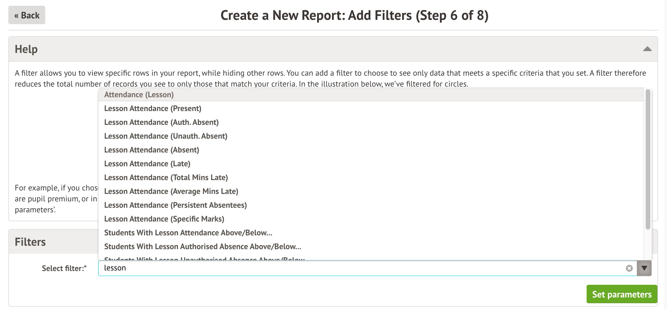 - Click the Select filter drop-down and choose Lesson Attendance (Present)