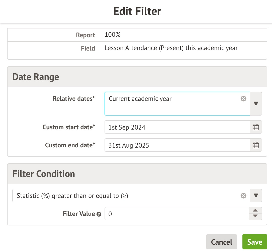 - On the Edit Filter slide-over, set the date range between which the students need to have been 100% present (this filters out students who did not have perfect attendance between those dates).