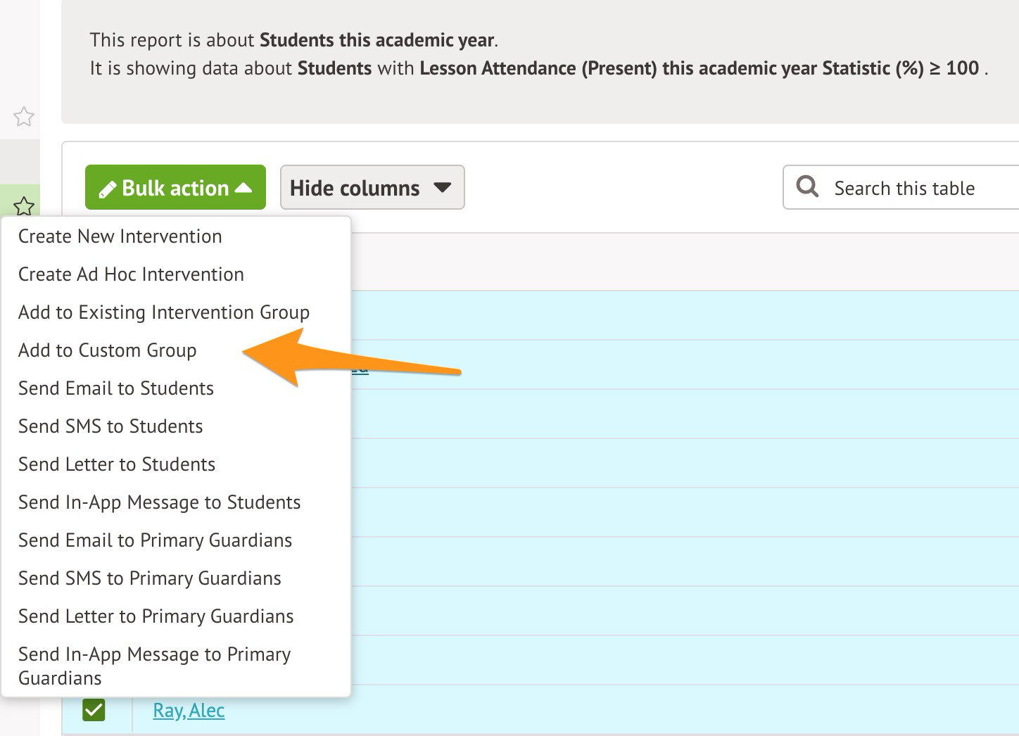 Now that you have the relevant students listed in a Custom Report, you can use the custom report to add your students to a custom group. To do this, follow these steps: