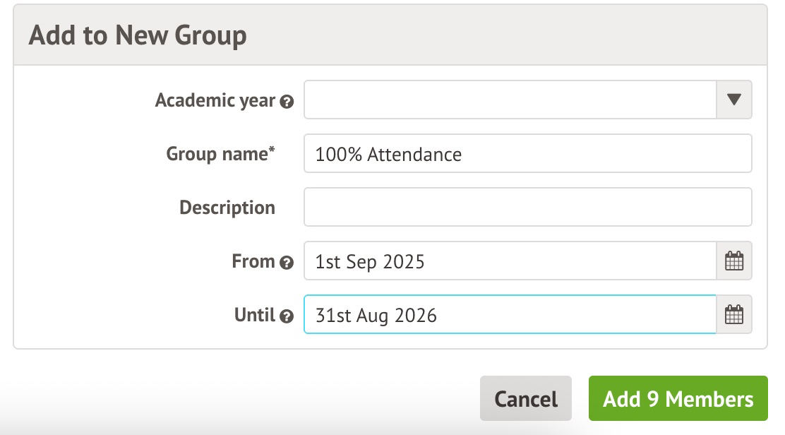 - Give your group a name and add From and Until dates - make sure these dates cover the attendance period you want to include in your certificates, so if you want attendance certificates for the whole academic year, make sure these dates reflect this.
