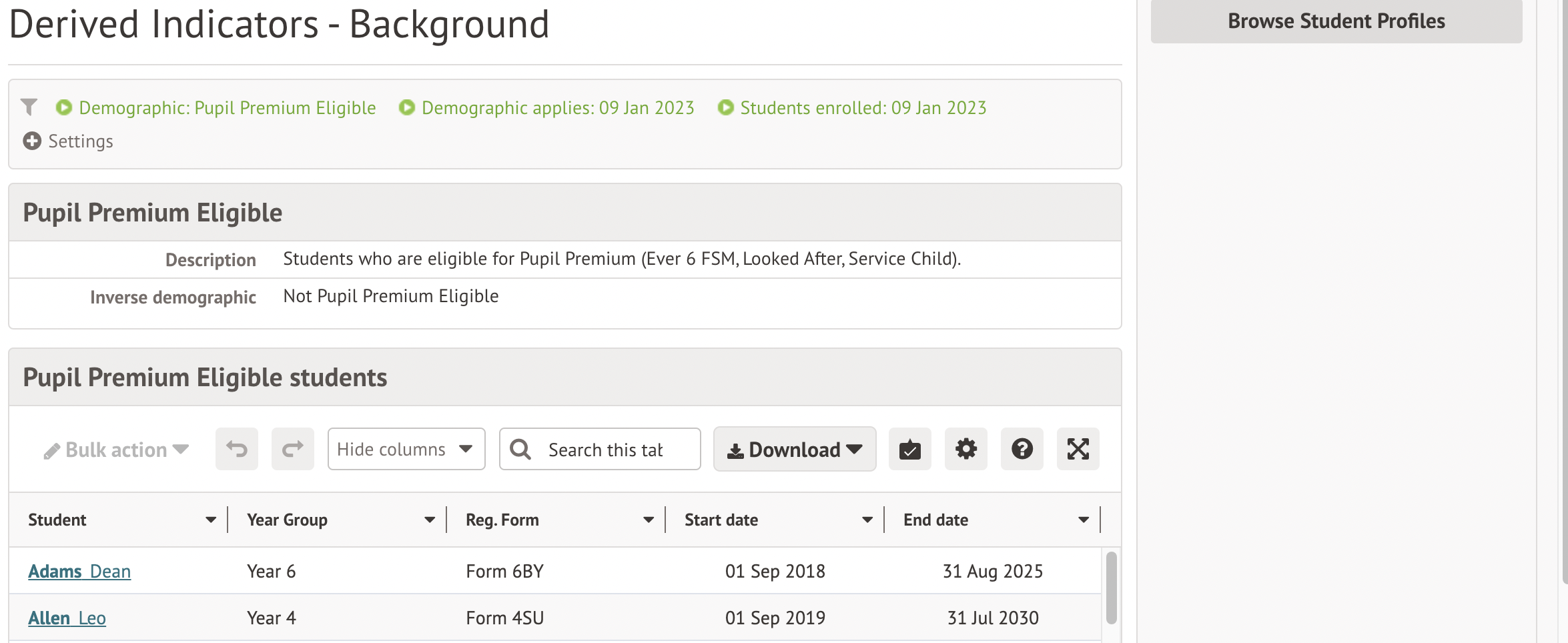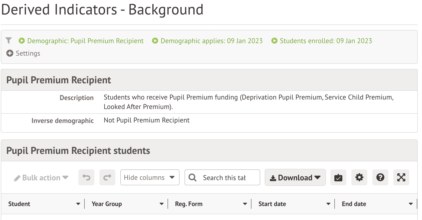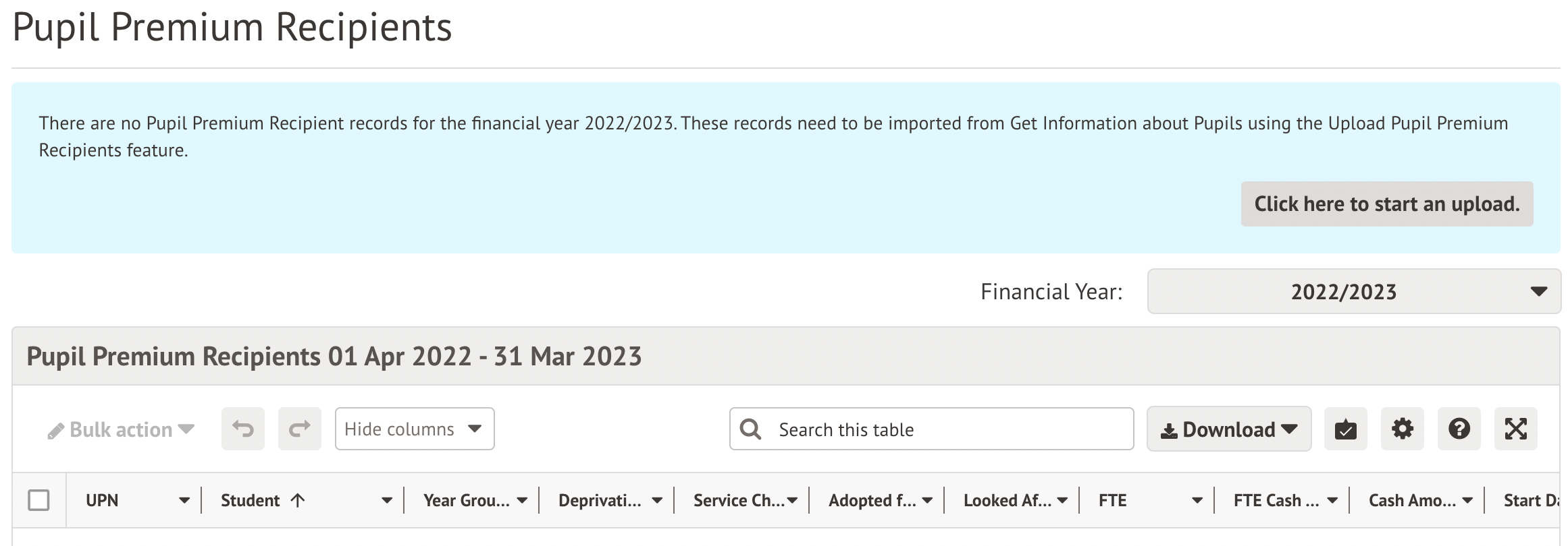 The Students > Demographics > Pupil Premium Recipients page shows the students for whom your school are getting funding during this Financial Year. You would have imported this file at the start of the new Financial Year (sometime in April). This article shows you how to do this at the start of the Financial Year.