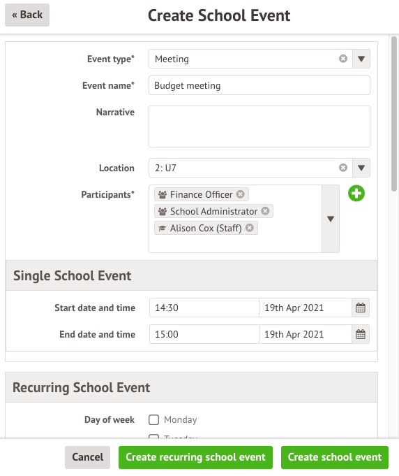 For a lesson that takes place in two classrooms at the same time, you can only book one room (room A) via the lesson's timetable slot, and adding an extra timetable slot linked to room B would cause duplicate registers. So, to book the second room, you need to create a (recurring) School Event that mirrors the lessons timetable slot to book the room instead, like the room booking process described in this guide. Find more on creating and managing events by clicking the link.