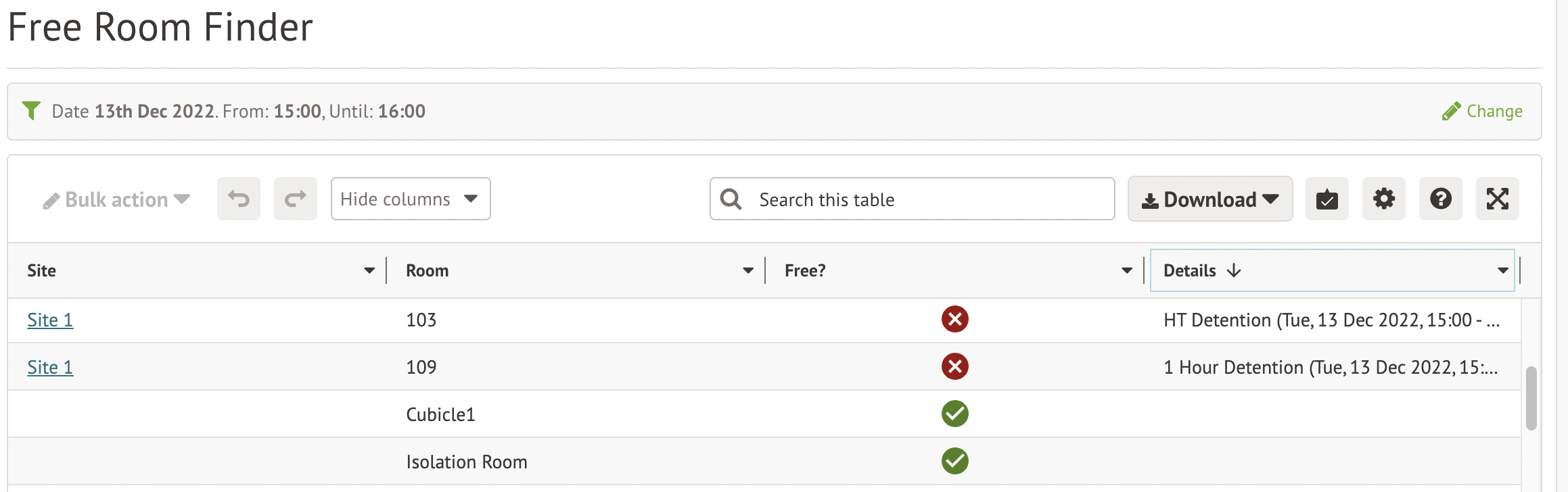 When creating an event, moving a room or allocating cover, you can select a room that is already in use. We allow double booking as schools often want to book two lessons in the same room, such as two PE classes on the sports field.