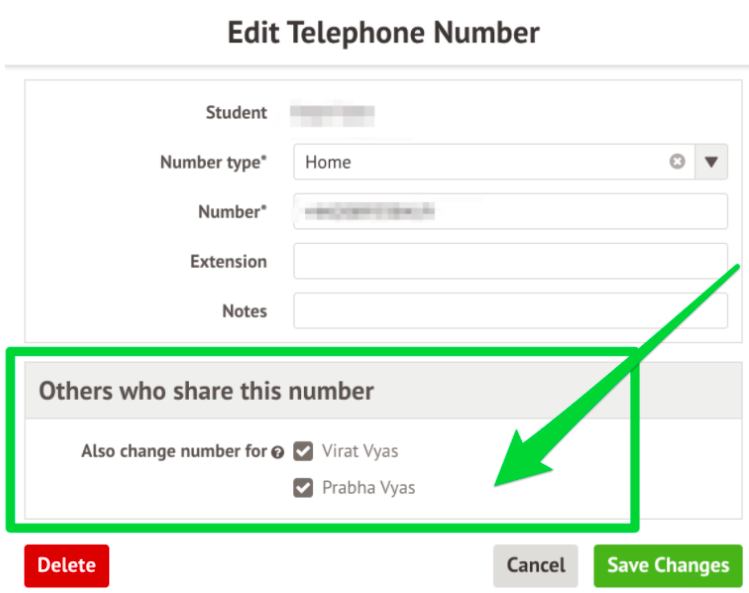 When editing a telephone number, keeping the names ticked in others who share this number will not delete the number off the other family members profiles. You would need to go to the other users' profiles to delete the number from there.