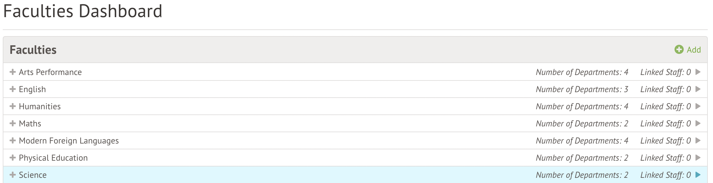 To set up your Faculties go to School > School Structure > Faculties. This will take you to the Faculties Dashboard where you can add and manage your School’s Faculties.