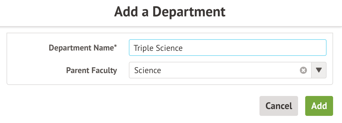 Click +Add to add a Department to the Faculty. This will create a brand new Department. In the slideover, you can select the Department name, then click Add.
